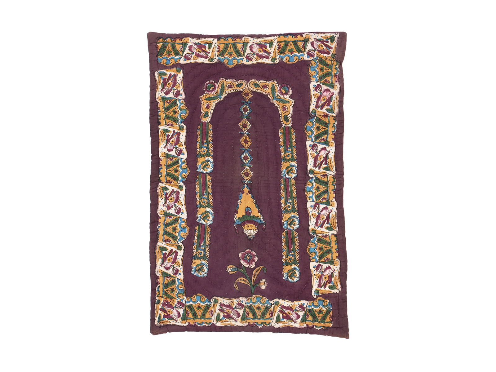 A lovely old quilt from Northwestern Turkey, with block printed floral motifs. Given its small size and the arch and hanging lamp in the center, it was probably used as a prayer rug or a wall hanging.