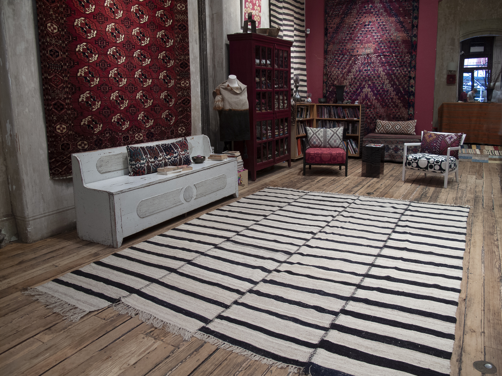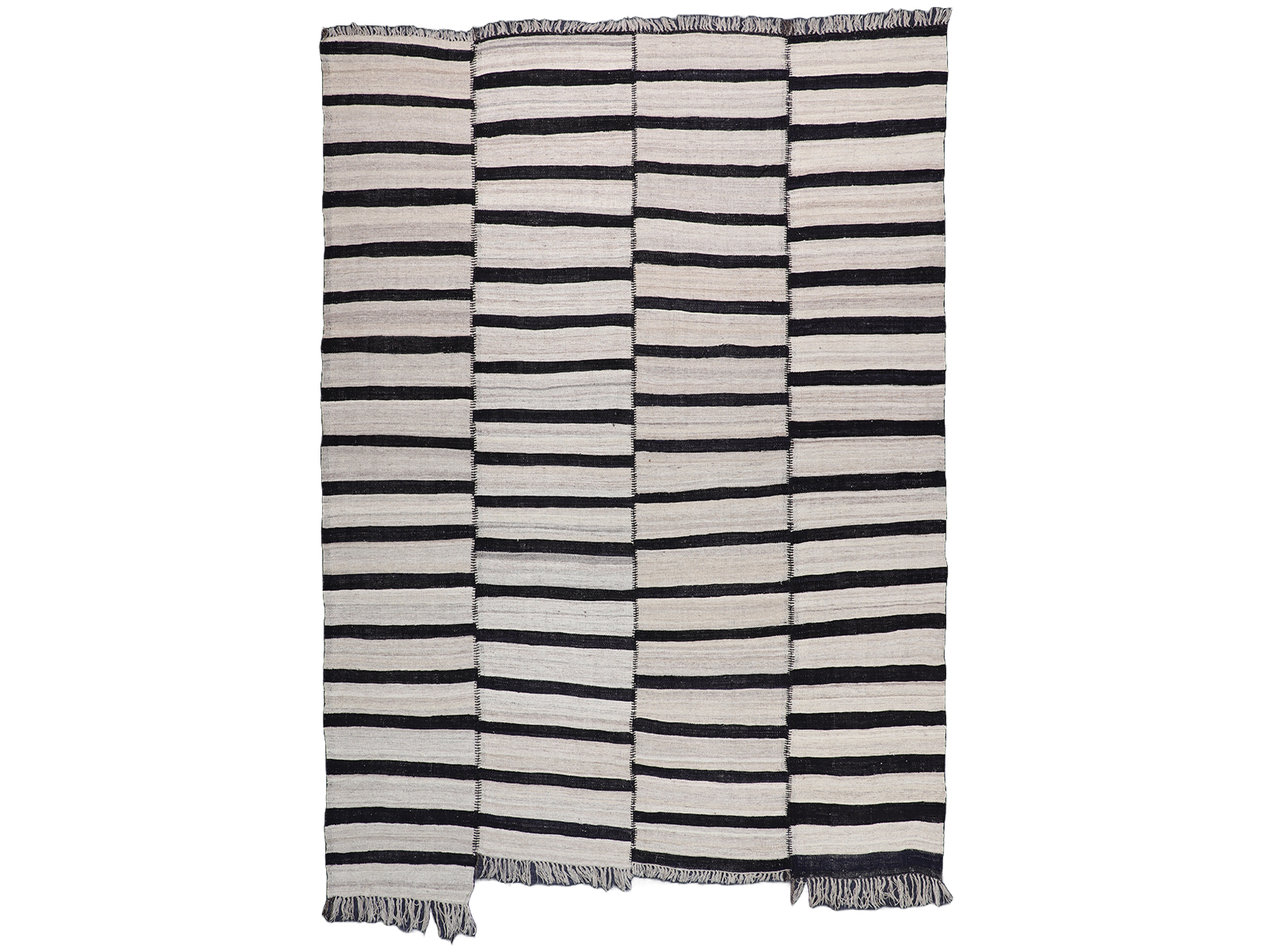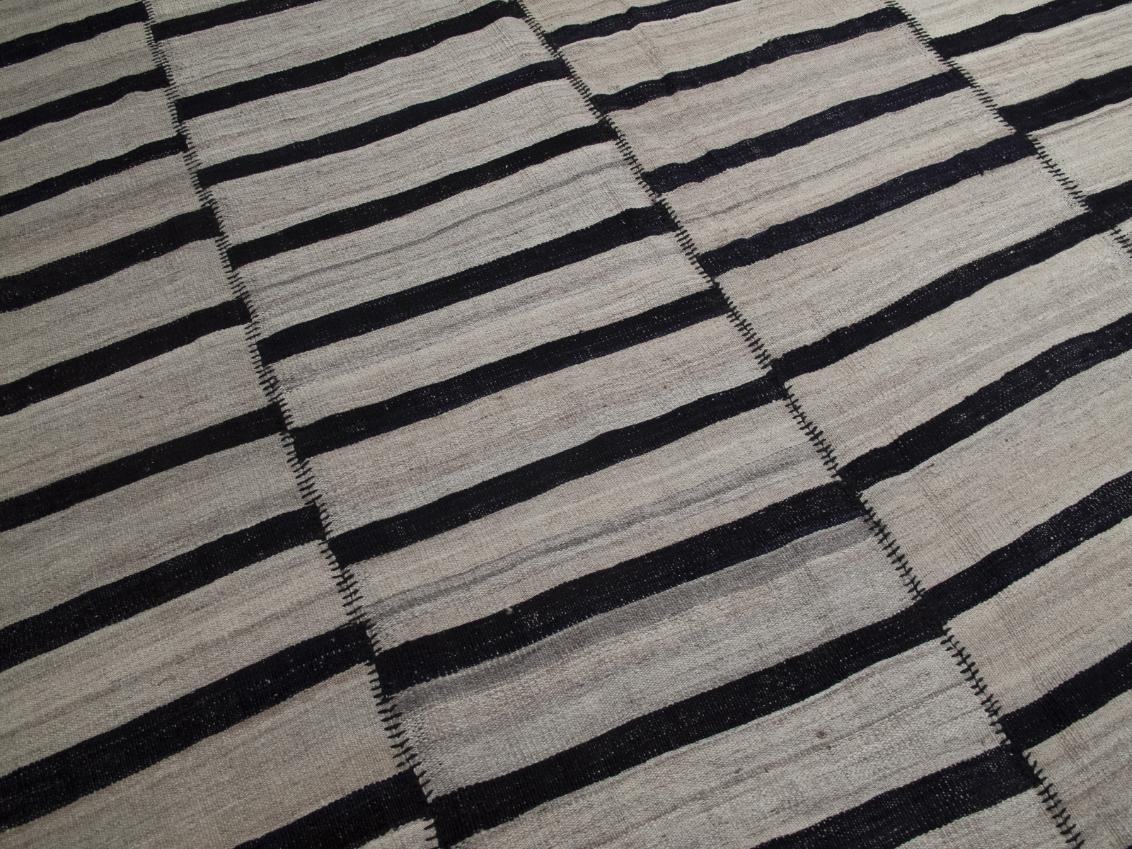 An old tribal floor cover from Northern Iran made for domestic use, woven in four panels on a narrow loom, with alternating bands of black-brown and ivory. Note the pleasing tonal variations in the close-up photos, lending depth and character to this authentic weaving that cannot be matched by its many modern imitators.