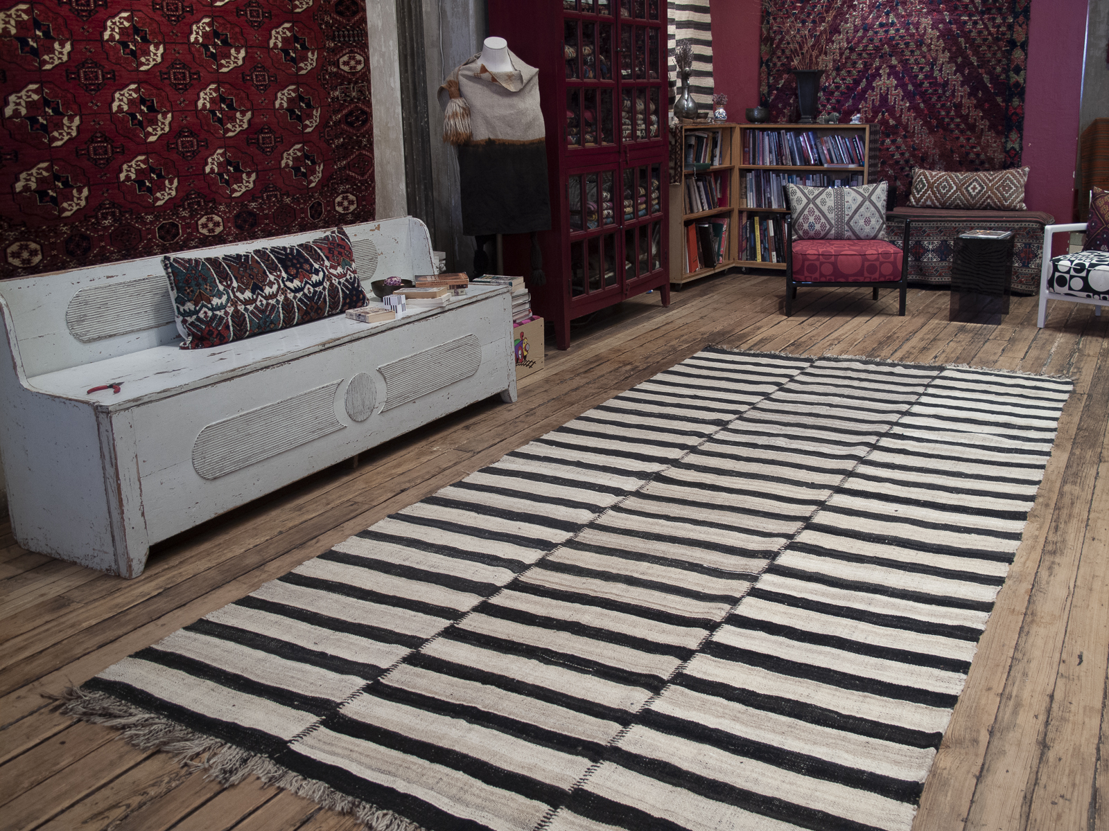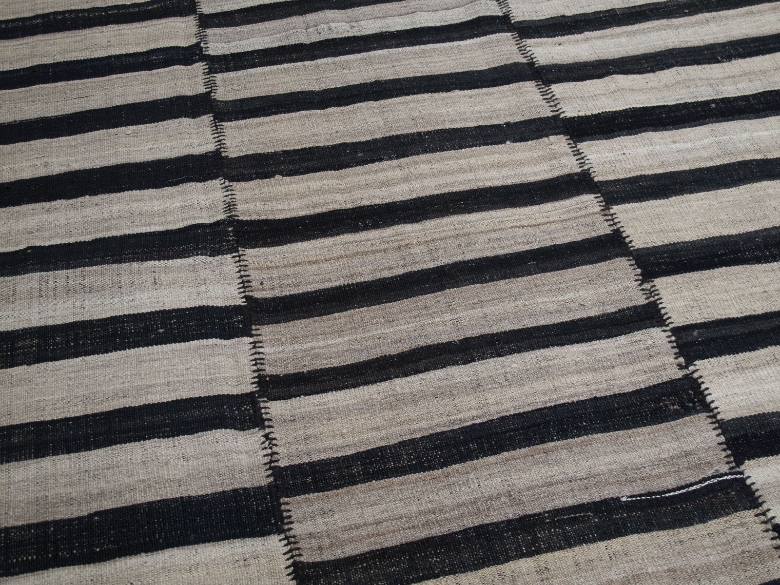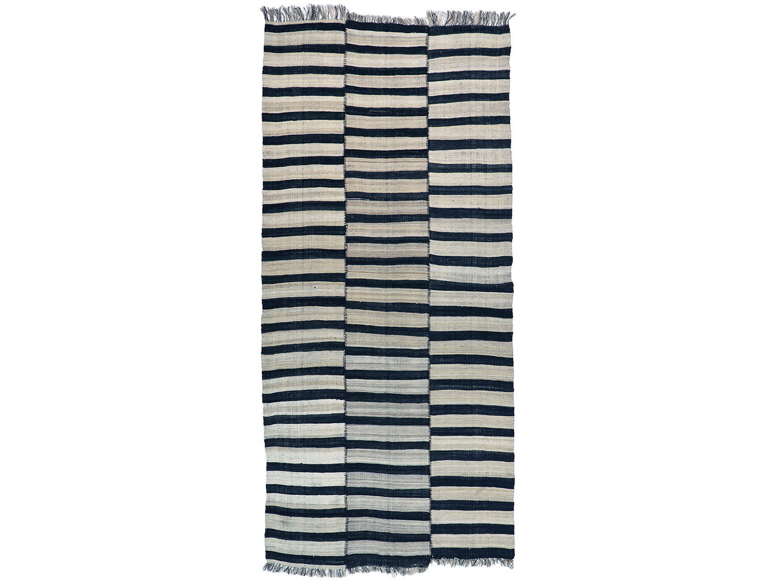 An old tribal floor cover from Northern Iran, woven in three narrow panels with alternating bands of ivory and dark brown. A strikingly modern look with great texture and patina that cannot be replicated in contemporary weavings.