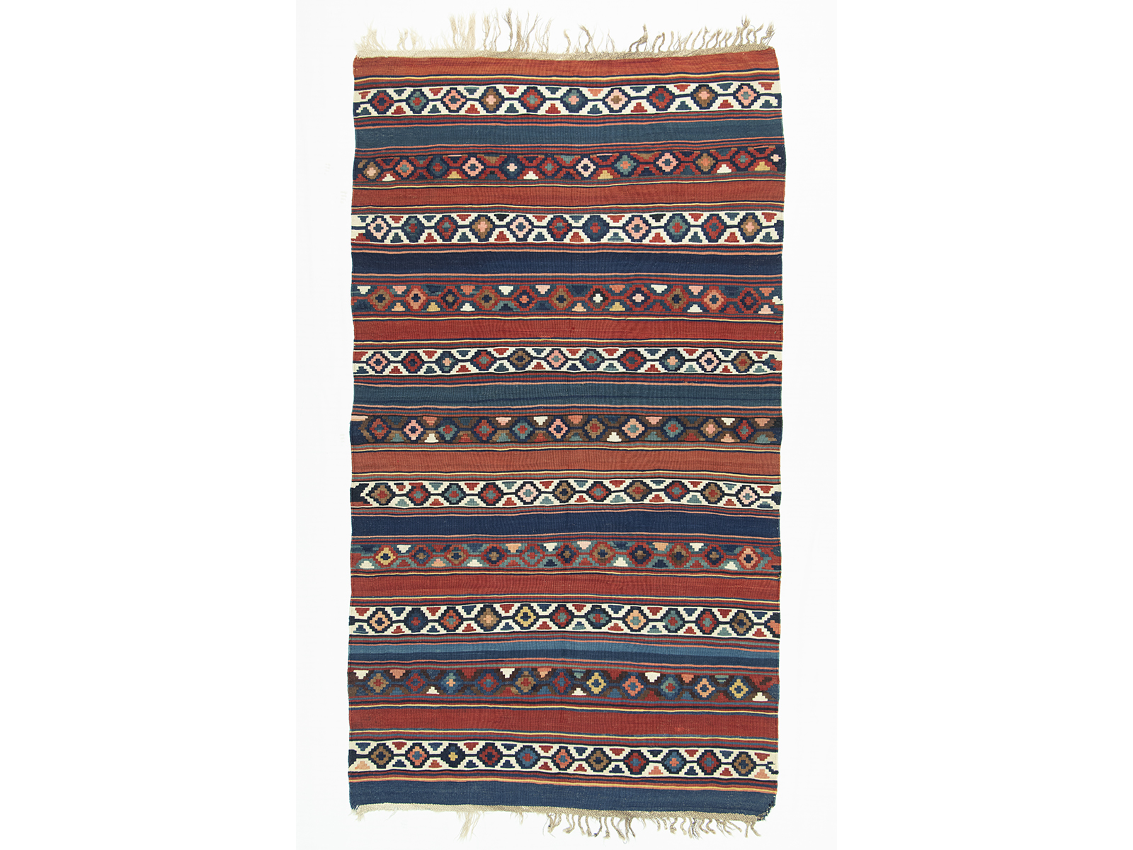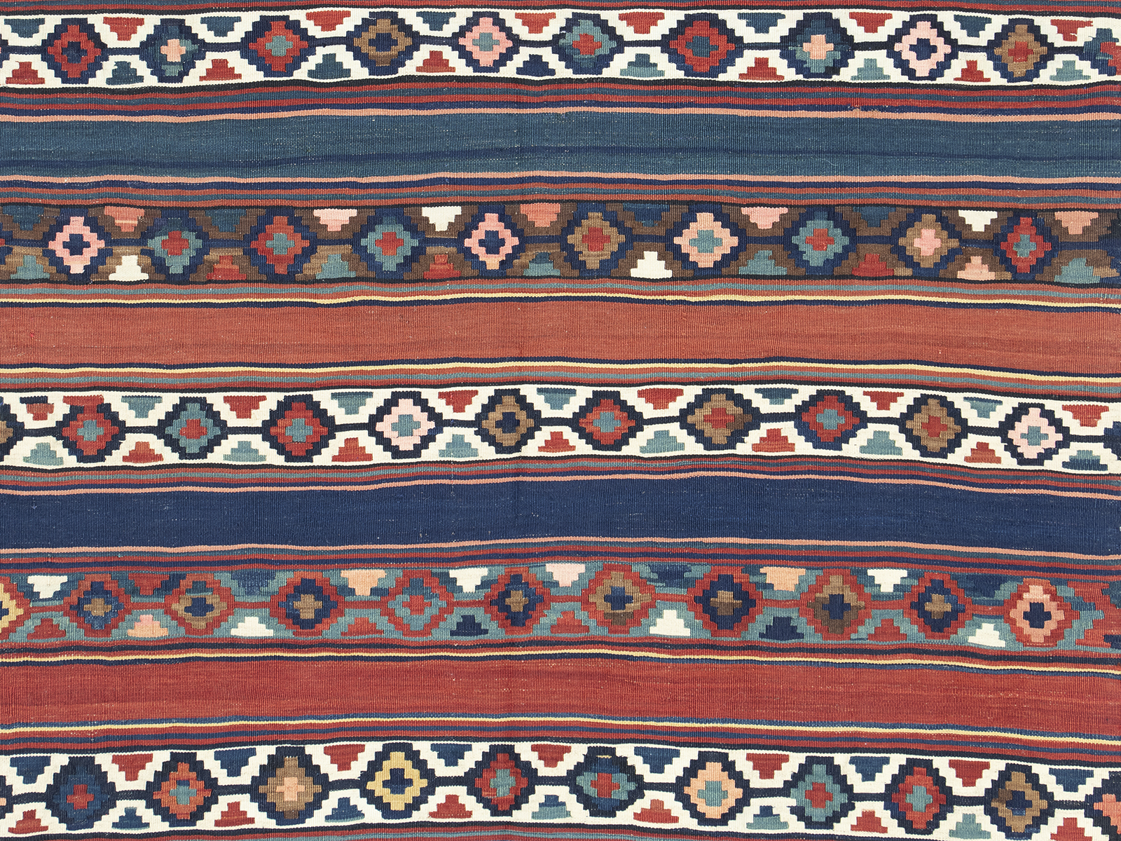 A classic antique tribal kilim from the Caucasian mountains with bands of alternating colors created with brilliant natural dyes.